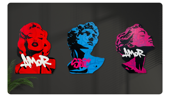 Nos œuvres, découpées sur bois, allient pop art et street art avec des visages iconiques et des couleurs vibrantes. Posées sur un meuble ou accrochées au mur, elles s’adaptent à tous les espaces.